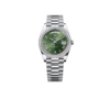 The Rolex Day-Date 40 combines timeless elegance with iconic design. Featuring a refined olive green dial accented by silver-toned hands and markers, this 40mm timepiece offers a bold yet sophisticated look.
