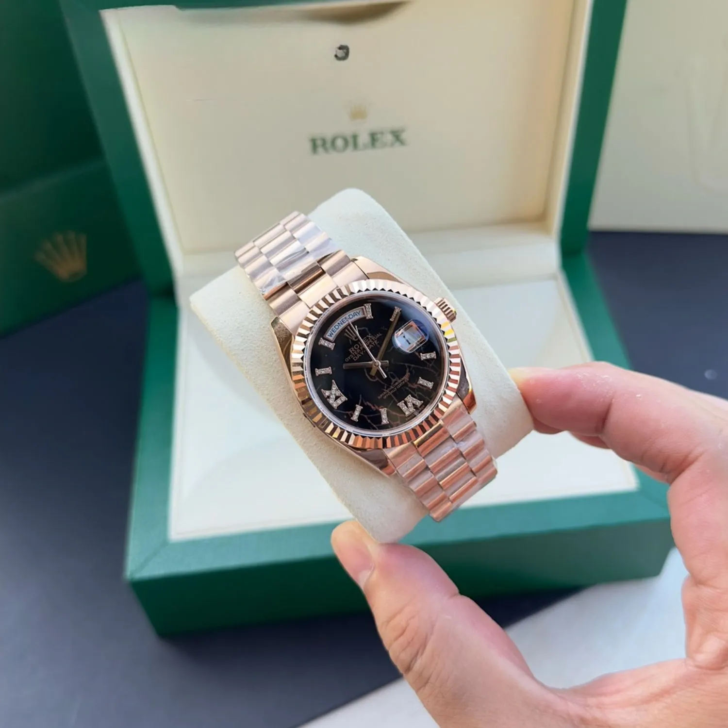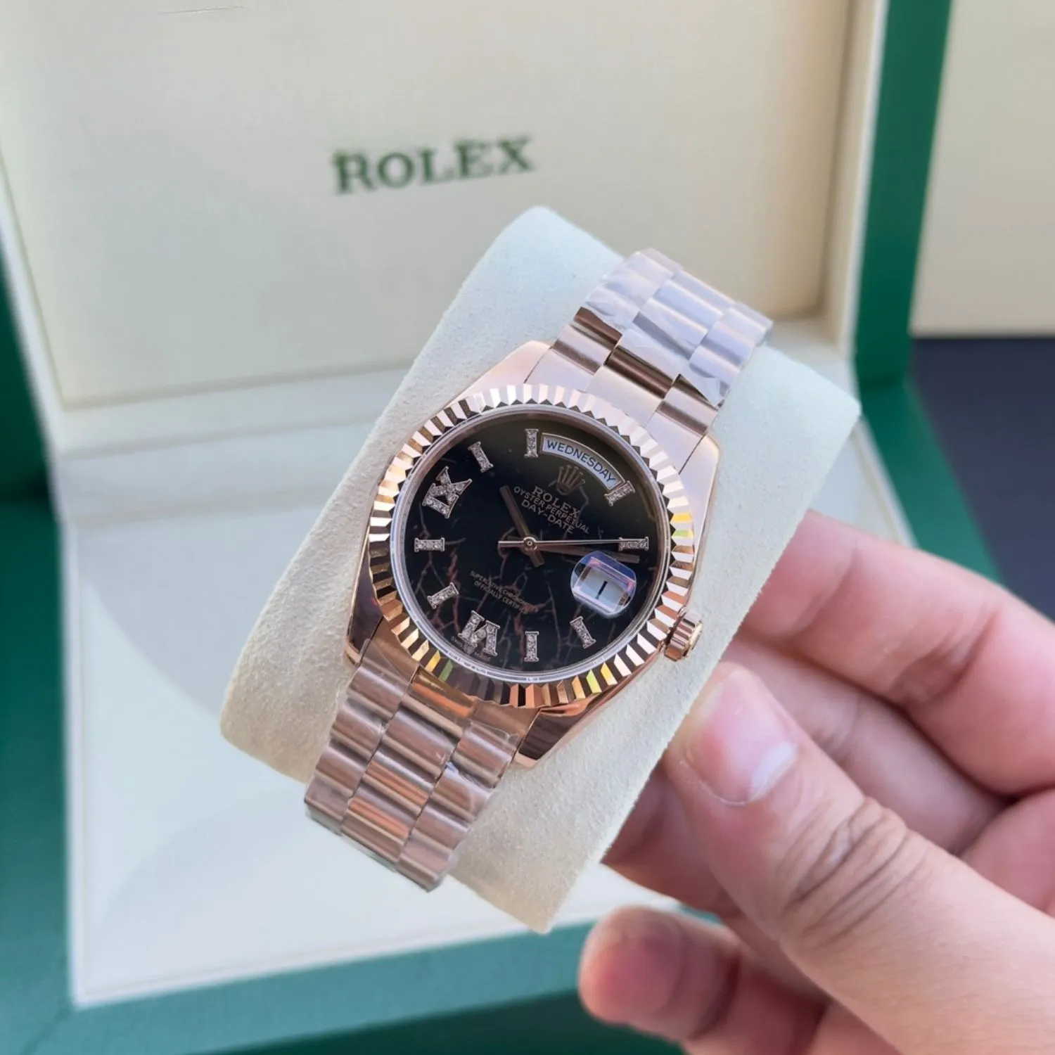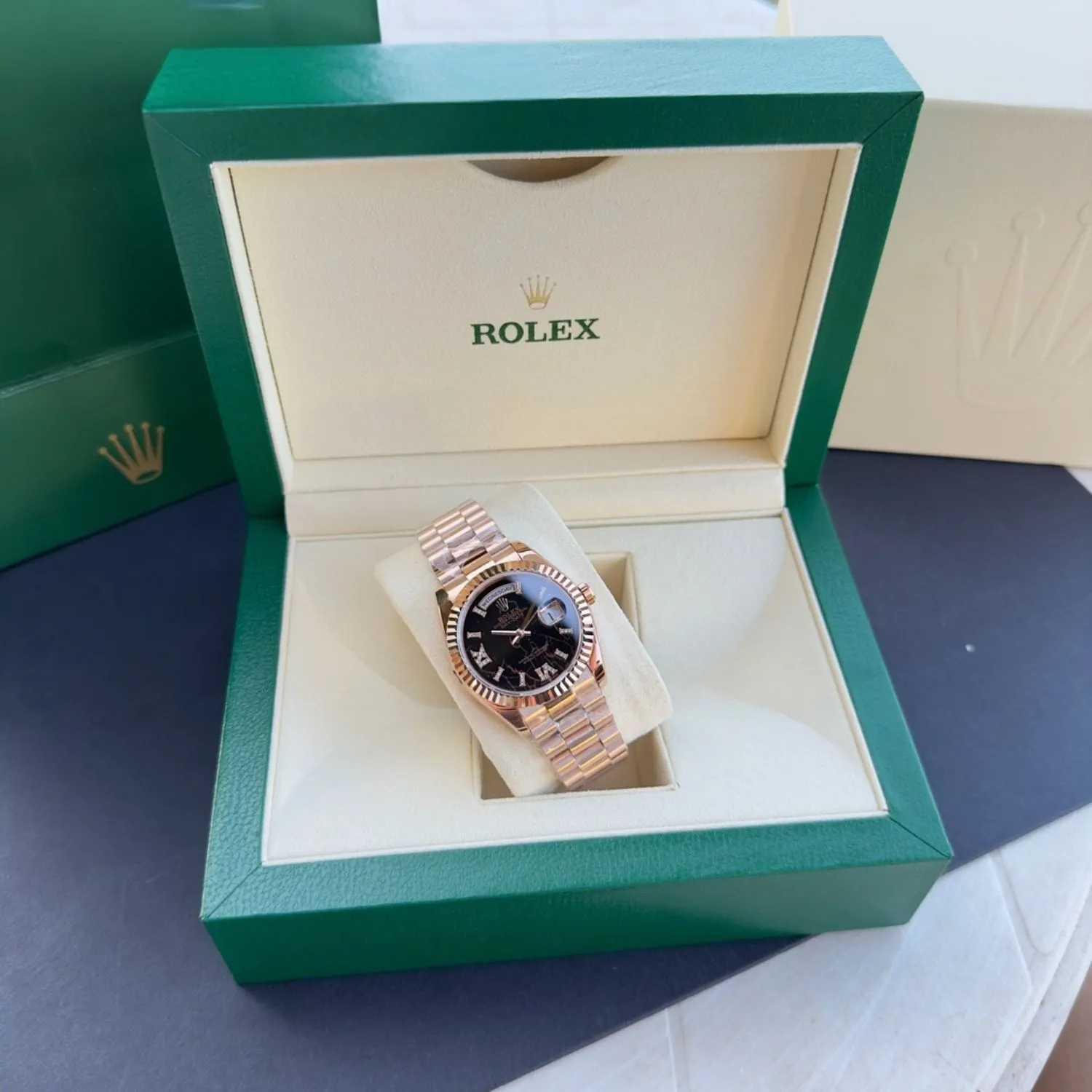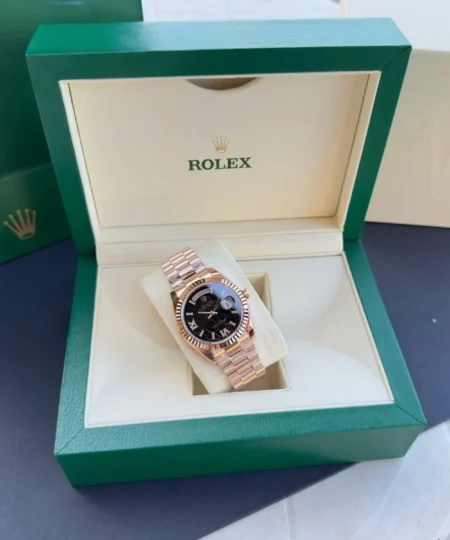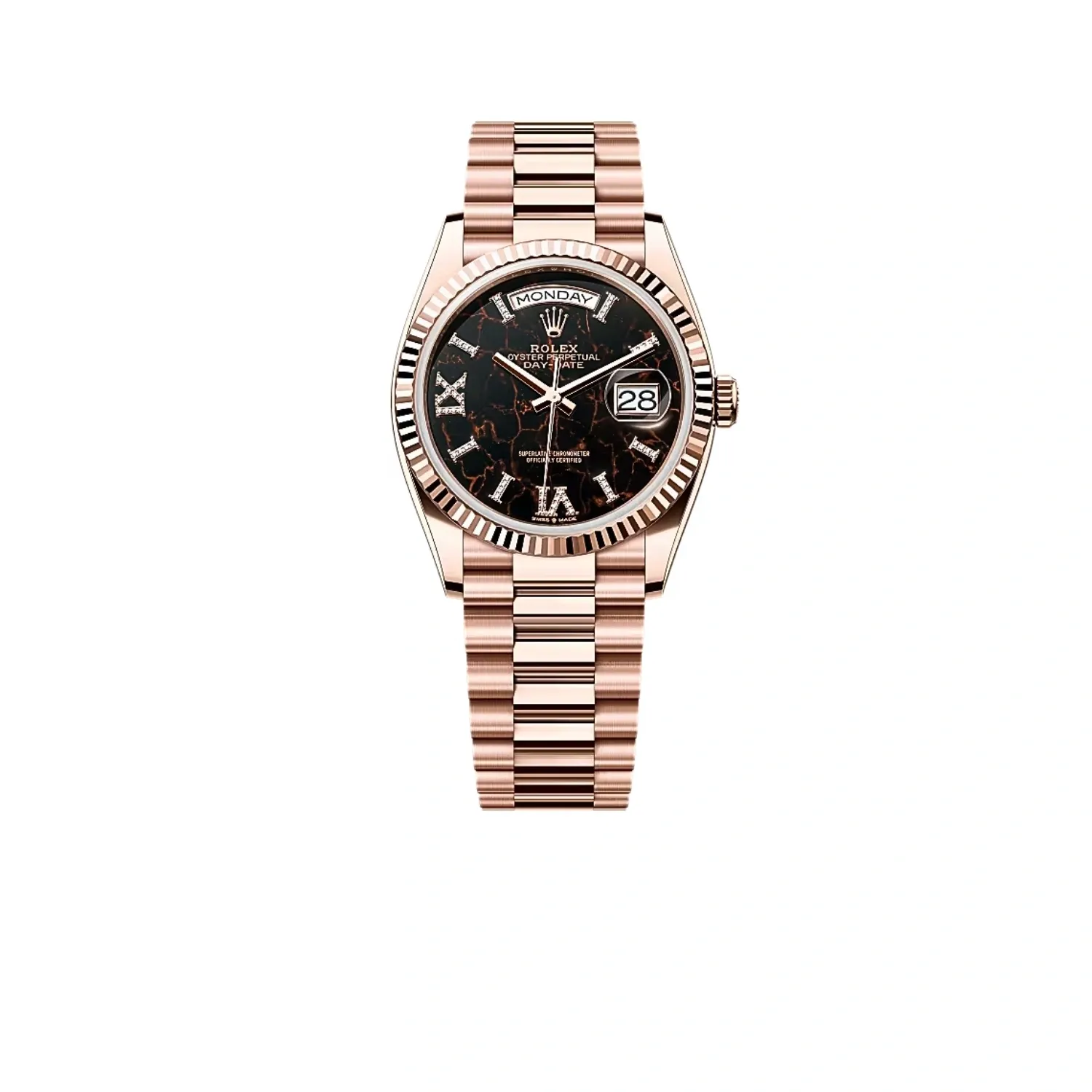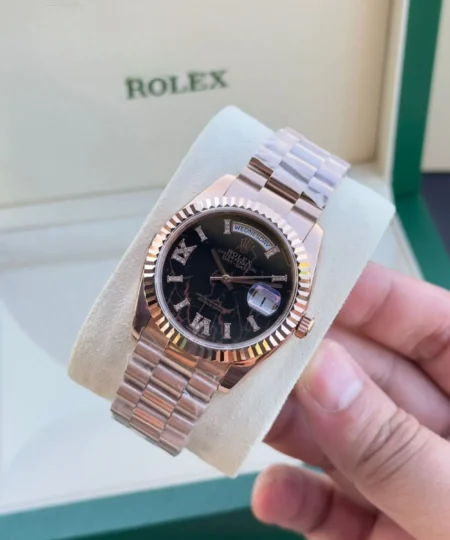 This Rolex Day-Date 36 features a deep black dial beautifully accented with diamond hour markers, combining elegance with unmistakable luxury. The Everose gold case and President bracelet give the watch a warm, refined appearance, while the fluted bezel adds a classic Rolex signature.