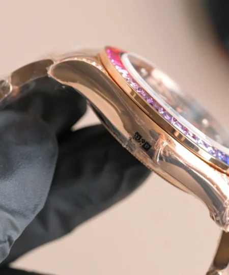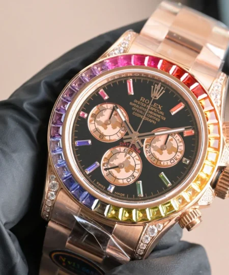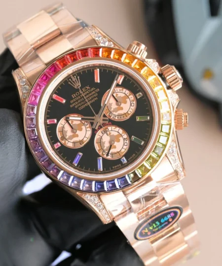 The 40mm case frames a champagne dial with three black sub-dials, giving the watch a bold and luxurious contrast. A black tachymeter bezel enhances its racing-inspired chronograph functionality.