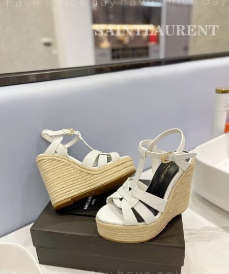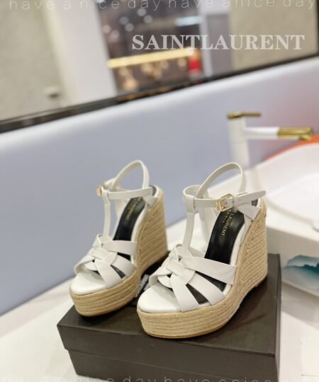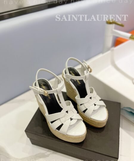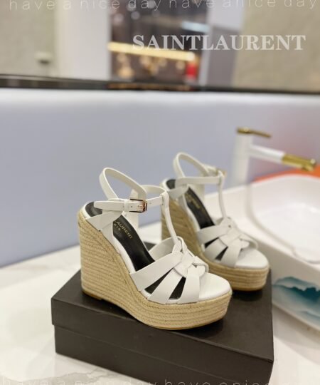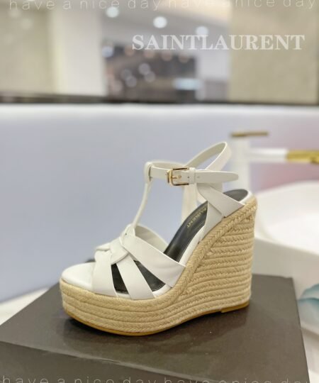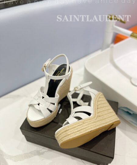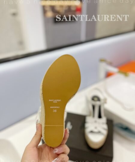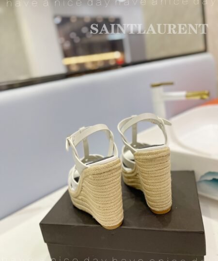 - Featuring a jute midsole and adjustable ankle strap engraved with saint laurent paris.