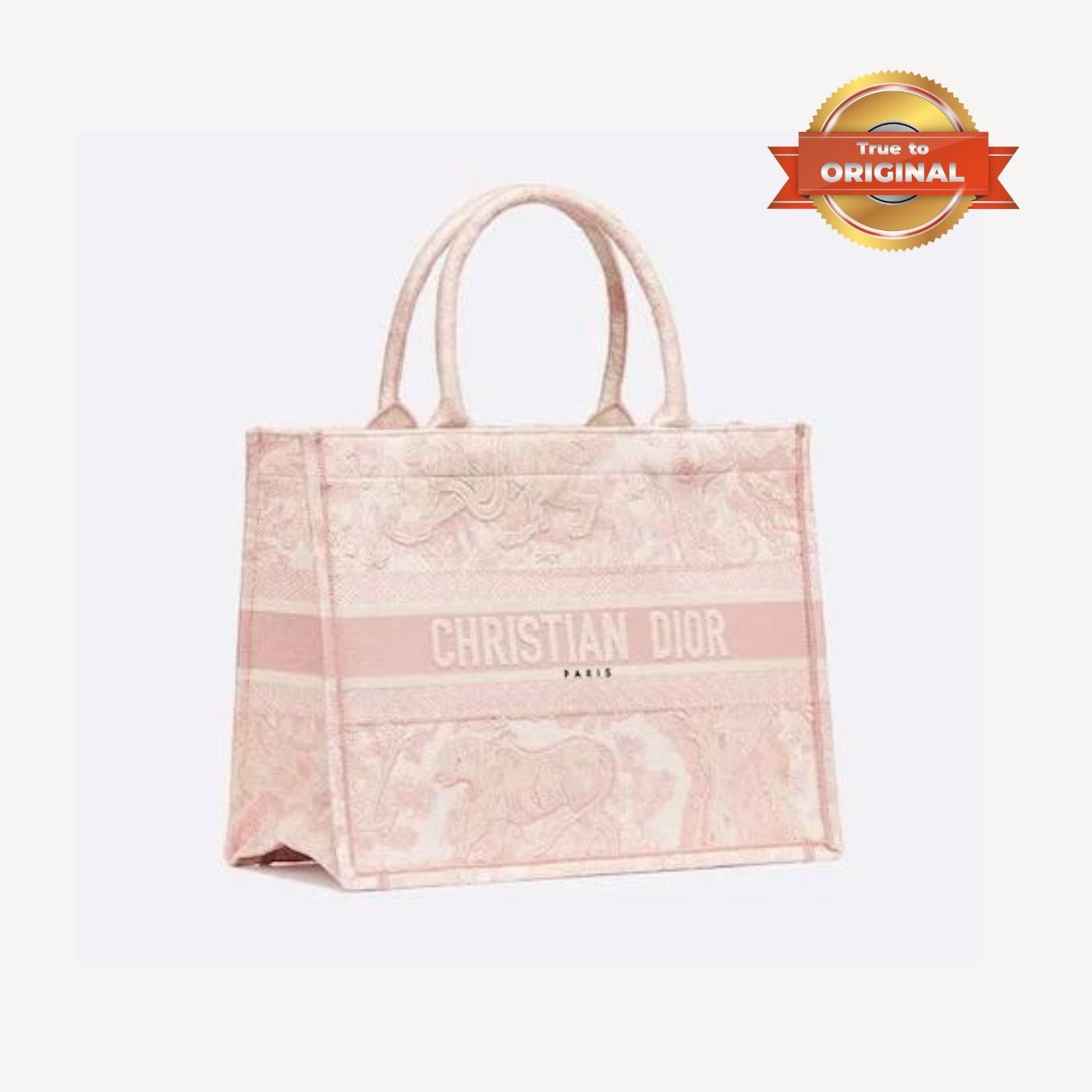 - Introduced by Maria Grazia Chiuri, Creative Director of Christian Dior, the Dior Book Tote has become a staple of the Dior aesthetic. Designed to hold all the daily essentials, the style is fully embroidered with a Pink Toile de Jouy Reverse motif, a variation of the House’s hallmark pattern with a play on reversed colors. Adorned with the CHRISTIAN DIOR PARIS signature on the front, the medium tote exemplifies the House’s signature savoir-faire and may be carried by hand or worn over the shoustrap